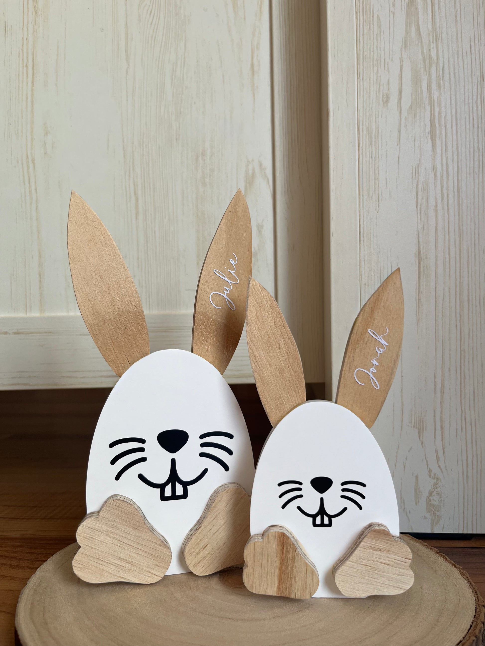 2er-Set stehende Hasen mit Holzohren, Holzpfoten und Namen