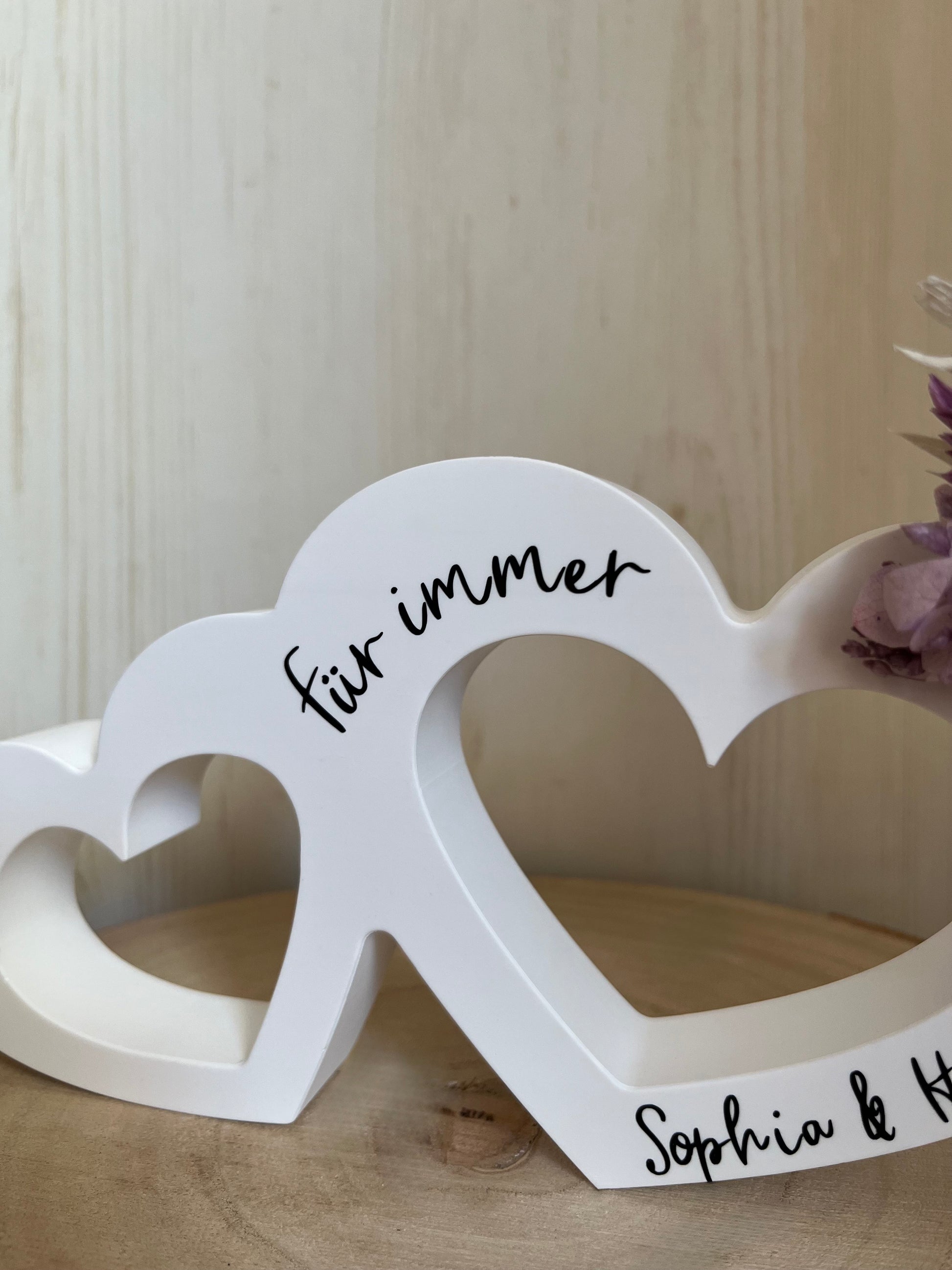 Dieses stilvolle Doppelherz ist ein besonderes Geschenk zur Hochzeit – persönlich, zeitlos und mit viel Liebe gestaltet. Verziert mit zarten Trockenblumen und individuell personalisiert mit den Namen des Brautpaars, wird es zu einem Erinnerungsstück, das bleibt.