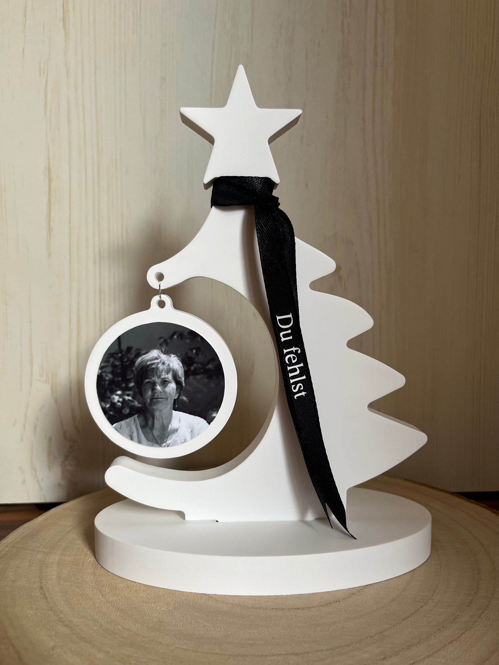 Dieses liebevoll gestaltete Erinnerungsbäumchen trägt eine gegossene Kugel, auf der das Foto eines geliebten Menschen bewahrt ist – ein persönliches Andenken voller Herz und Gefühl.