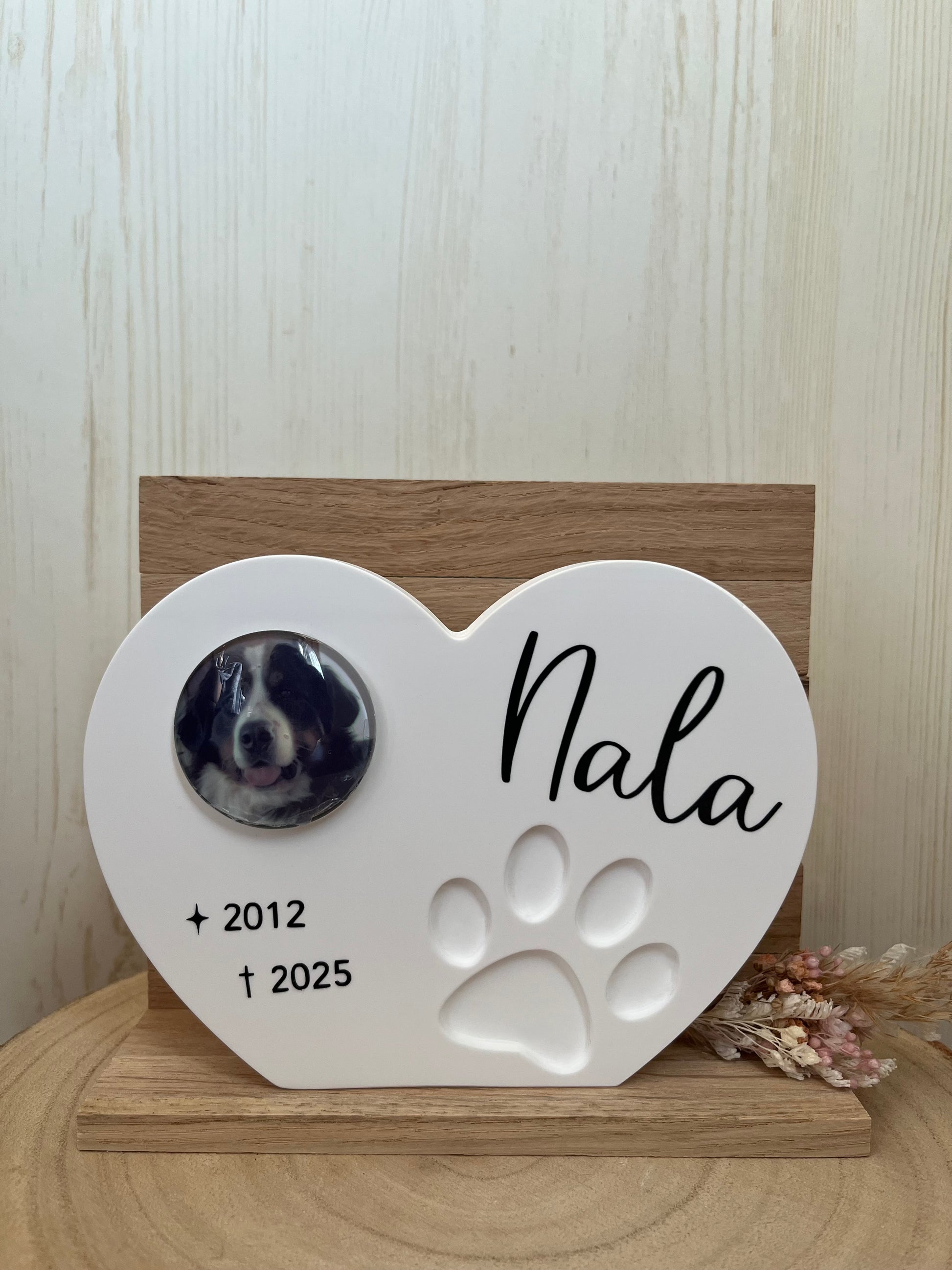 Herz mit Pfote und Foto, Klötzchenwand und Blumen