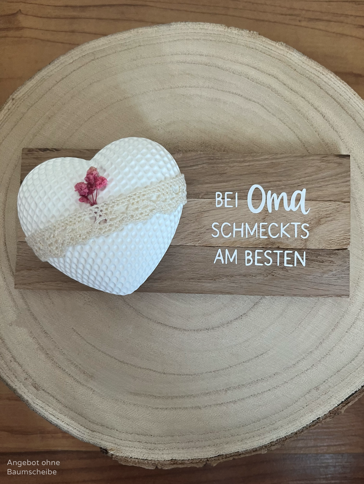 Dieses liebevoll gestaltete Rautenherz mit Klötzchenleiste und der Aufschrift „Bei Oma schmeckts am besten“ ist das perfekte Geschenk für alle, die ihrer Oma einfach mal „Danke“ sagen möchten.