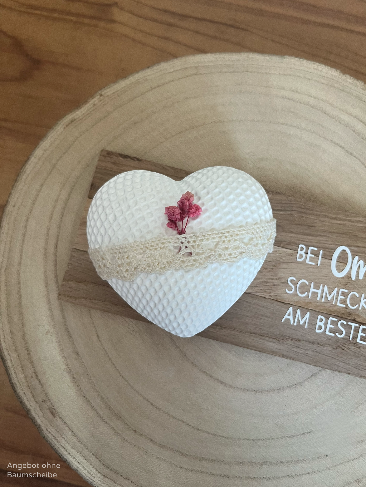 Mit zartem Dekorband und einem kleinen Trockenblumen-Detail kombiniert es Natürlichkeit mit einem modernen, handgemachten Look.