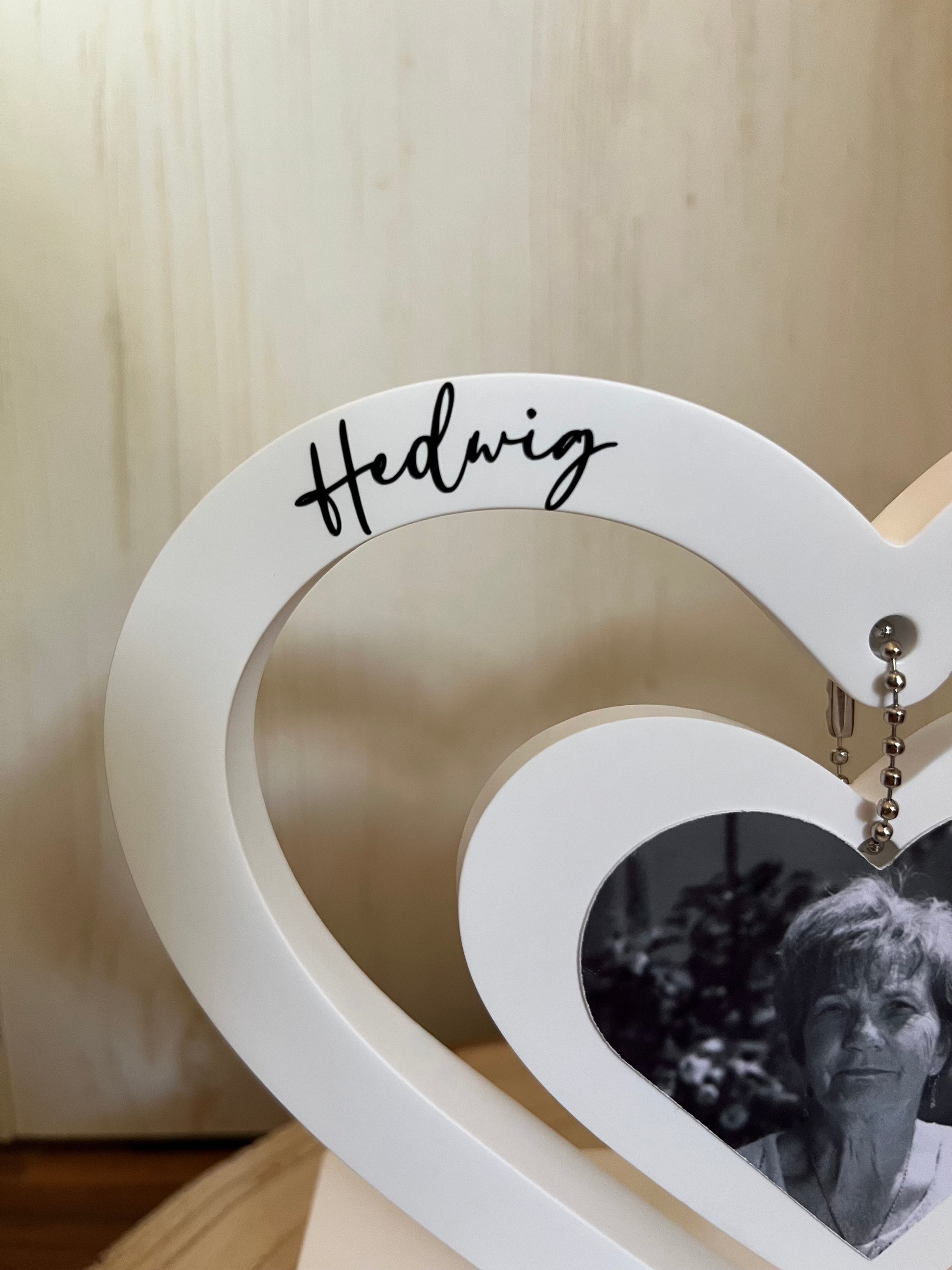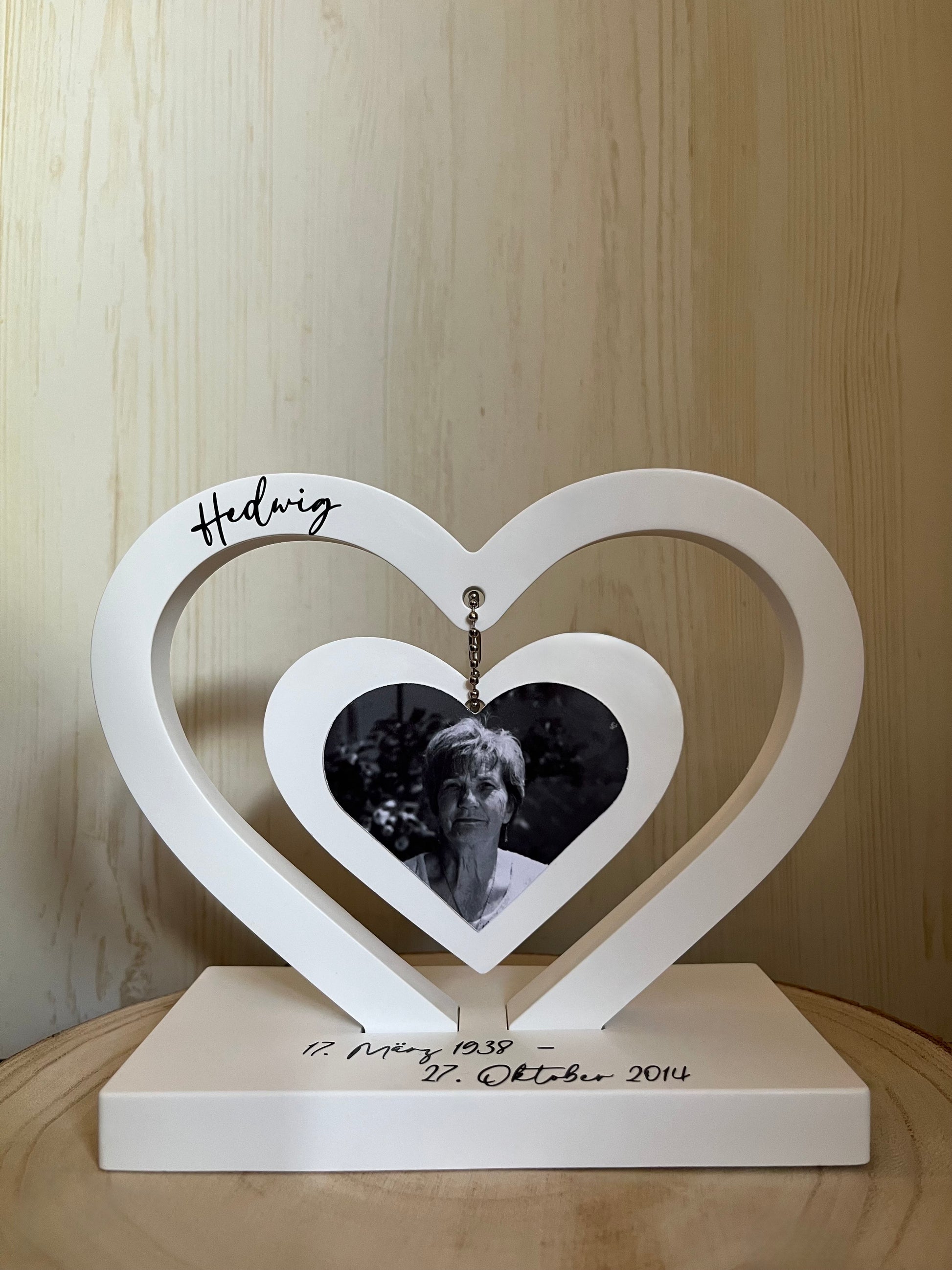 Dieses Herz bietet Raum für ein Foto sowie Name, Geburts- und Sterbedatum – dezent, stilvoll und mit viel Gefühl gestaltet.