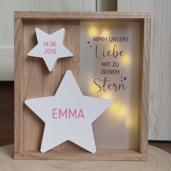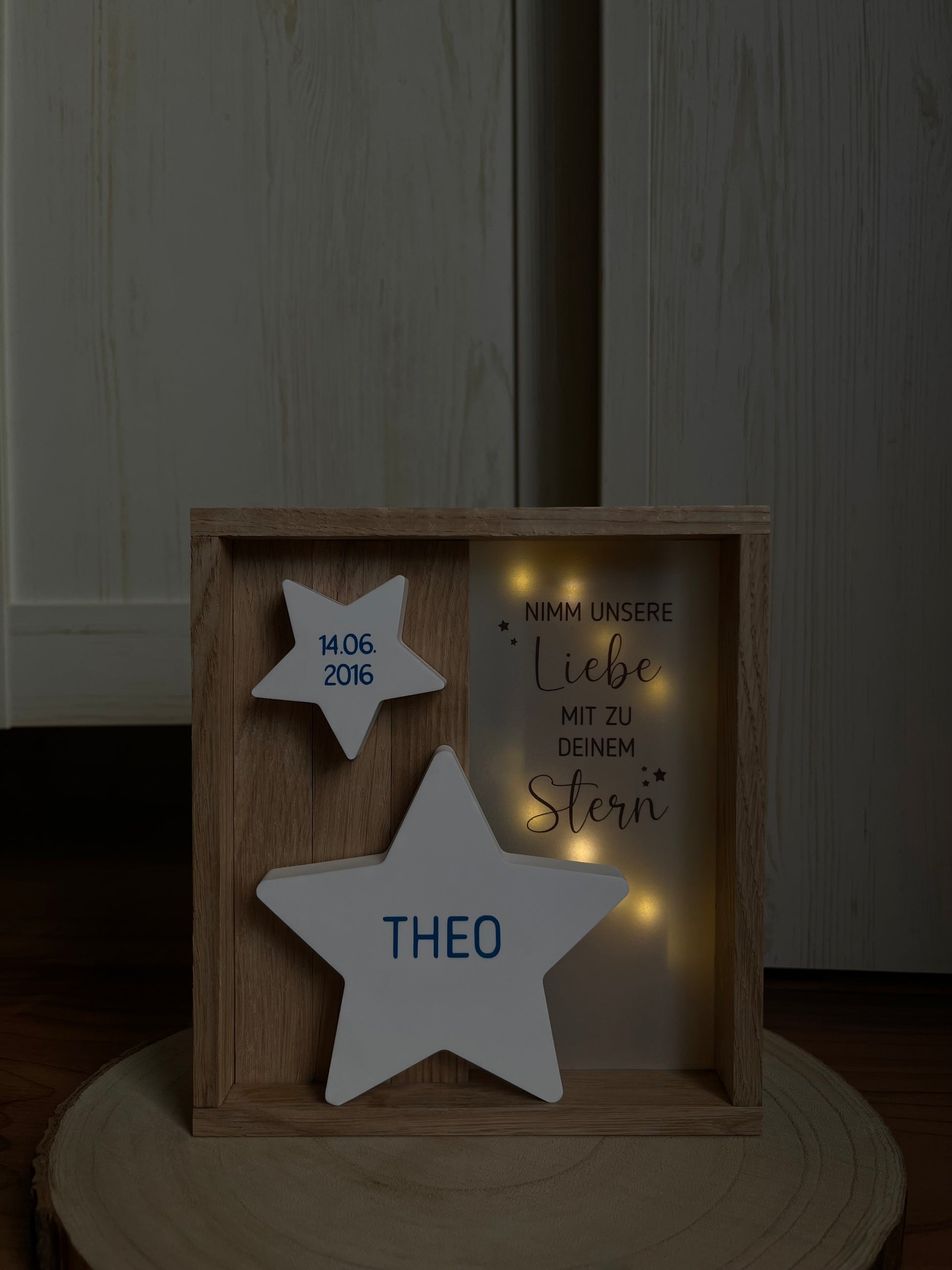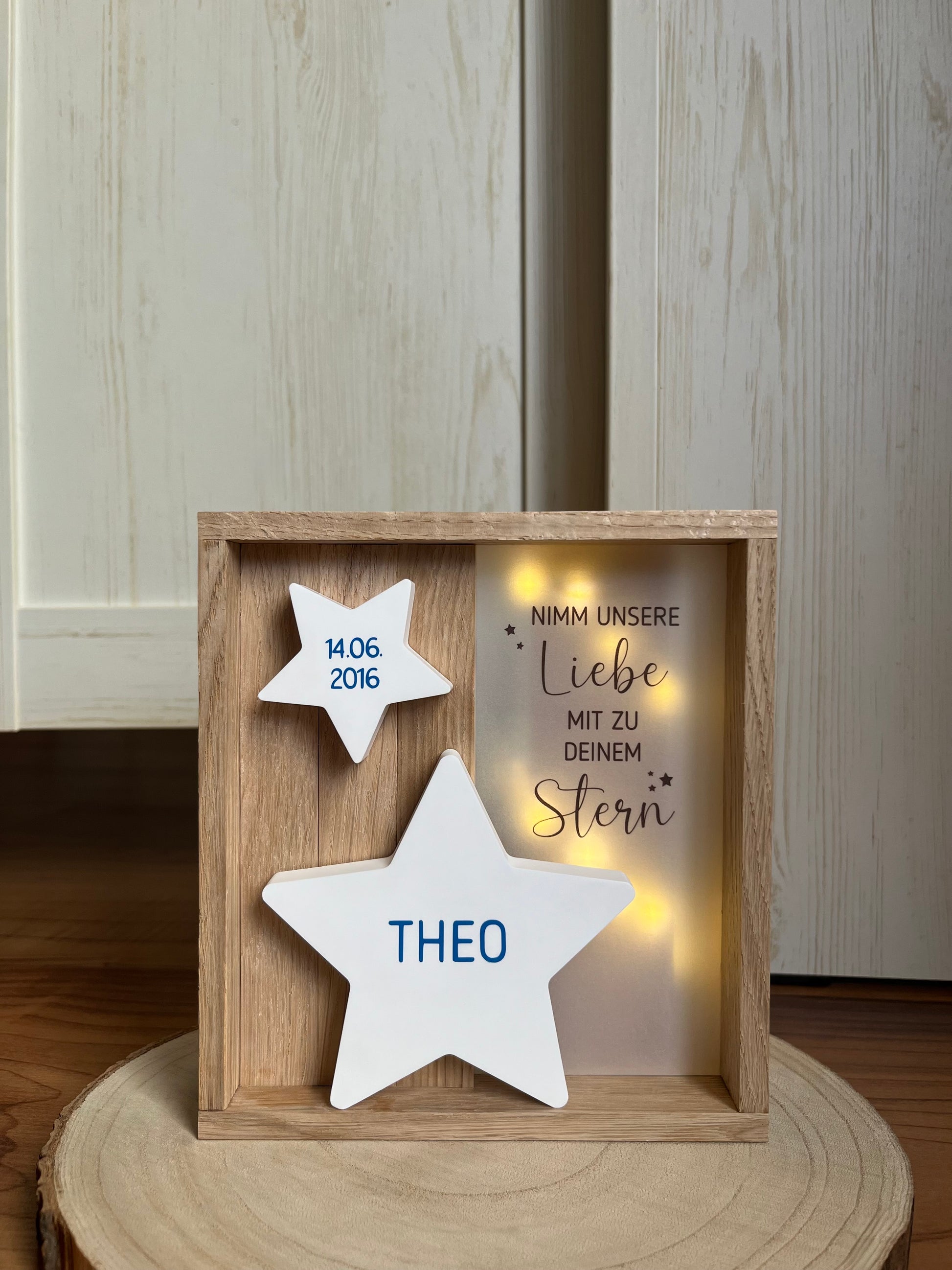 Trauerholzrahmen Sternenkind blau, Stern mit Name und Datum, Spruch auf Transparentpapier und LED-Lichterkette
